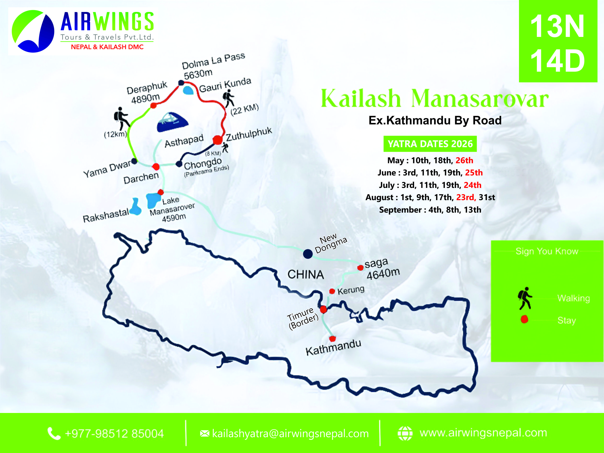 AIRWINGS Tours & Travels Pvt. Ltd. is a trusted local tour operator with over 8 years of experience in organizing the Kailash Mansarovar Yatra. With offices in Kathmandu & Sinauli Uttar Pardesh, we offer fixed group departures and private tours—all managed directly by our expert team of guides, sherpas, and support staff.Join our group or plan a custom trip — contact us now for booking.